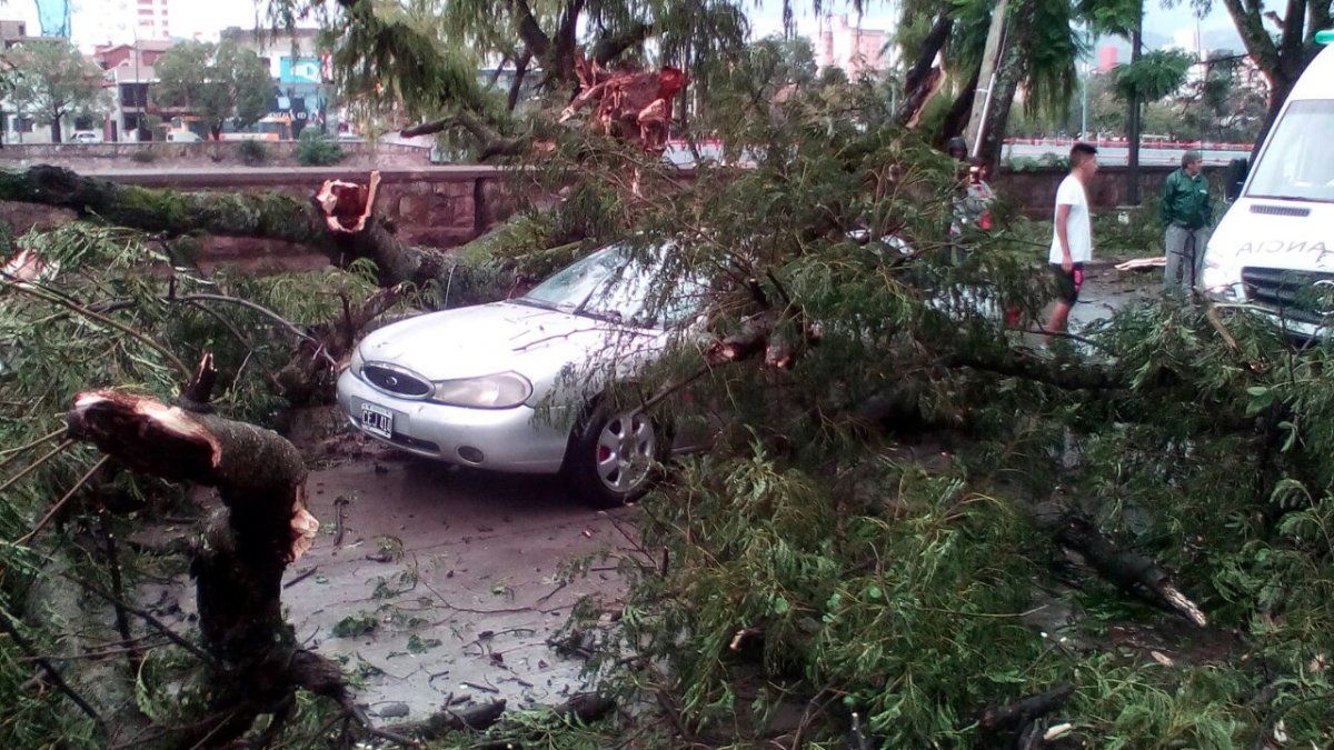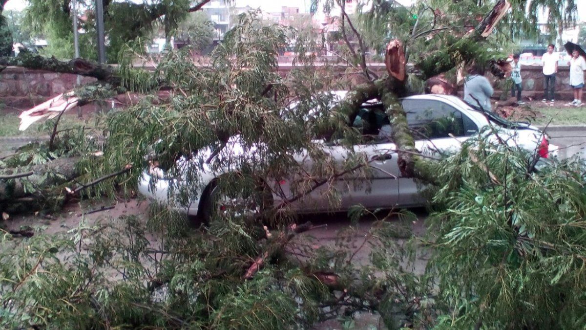Una familia se llevó un gran susto cuando circulaba con su auto por calle Hipólito Yrigoyen y un árbol se vino abajo aplastando el vehículo.