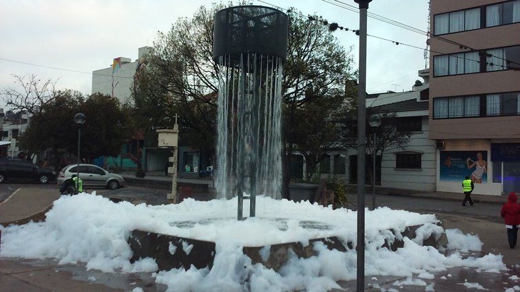 Ya sea como picardía, acto de vandalismo o broma de mal gusto, arrojaron espuma en la fuente ubicada en Avenida 19 de abril y Lamadrid.
