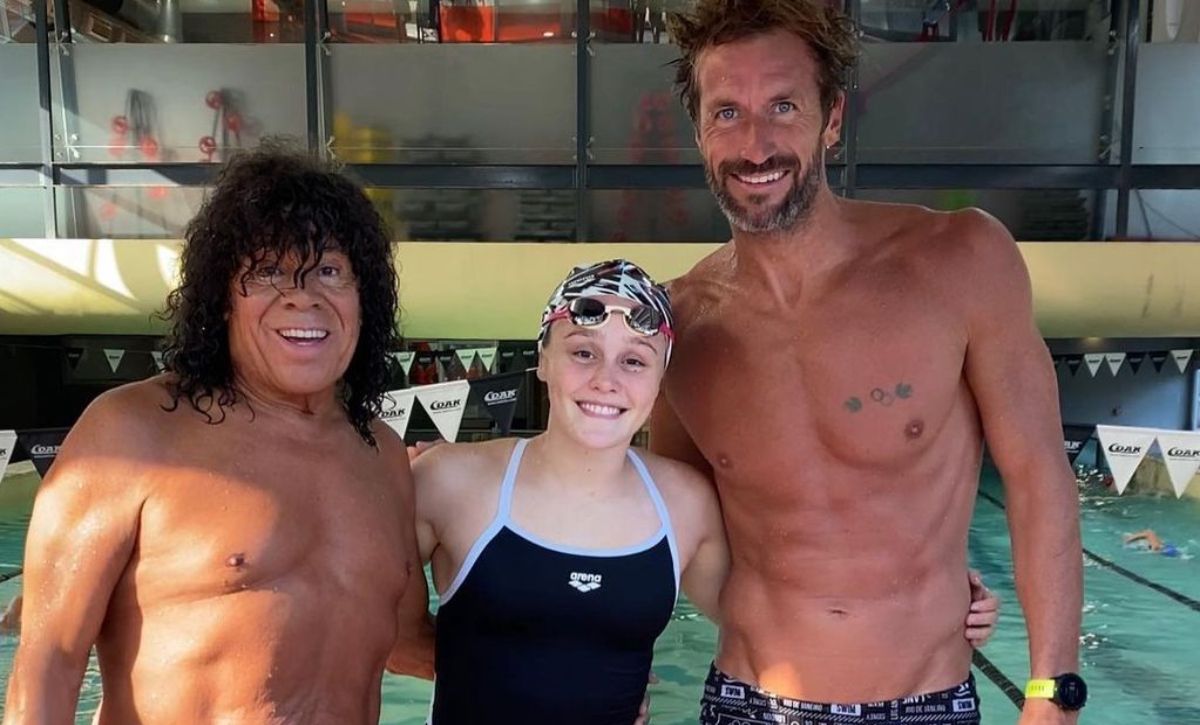 La hija del artista y madre de la adolescente también estuvo en el lugar y subió su reacción a las redes sociales. Jiménez se puso su malla, el gorro y las antiparras y saltó al agua para agarrar desprevenida a su familiar. Paloma estaba realizando su entrenamiento de todos los días cuando se topó con ambos dentro de su carril de natación.