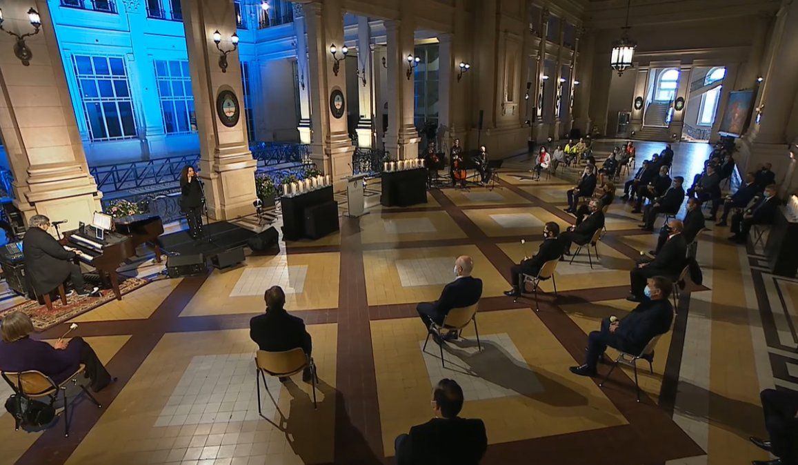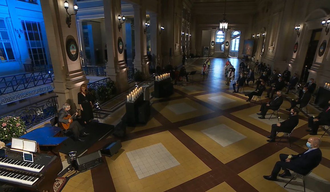 Luego, la actriz Laura Novoa recitó dos poemas “vinculados al carácter universal de la pandemia en términos humanistas”. Después siguieron con los homenajes los músicos Nadia Szachniuk y Juan Falú, con “Zamba para no morir” de Hamlet Lima Quintana. En tanto, la cantante Patricia Sosa entonó la canción “Nos Veremos Otra Vez” de David Lebón.