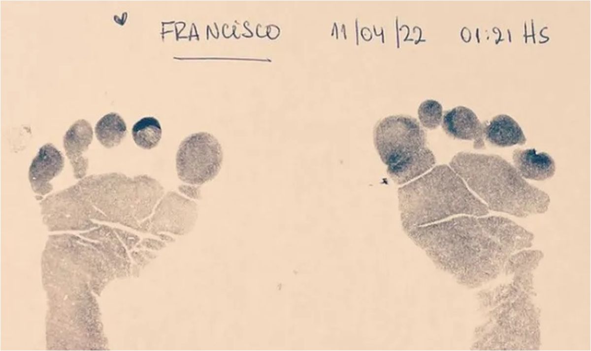 Junto a la breve descripción que dedicó al primer bebé presidencial en la historia de la Argentina, el jefe de Estados adjuntó una fotografía que muestra las huellas de las plantas de los pies del pequeño. En letra imprenta, se lee también el nombre “Francisco”, la fecha de nacimiento (11/04/22) y el horario (1.21).