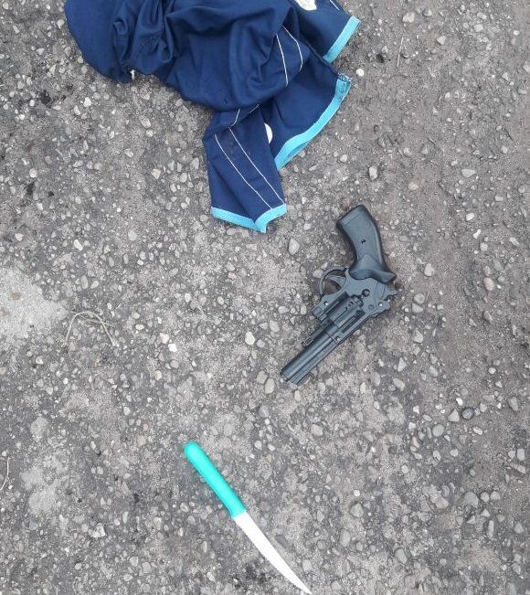 Inmediatamente se procedió a la demora de los sospechosos que estaban a bordo de una motocicleta Motomel Skua 150 c.c. de color blanca y azul. Al realizarle la requisa personal, a uno de los masculinos se secuestró entre sus pertenencias un cuchillo tipo sierra, y al siguiente un arma de fuego de juguete.