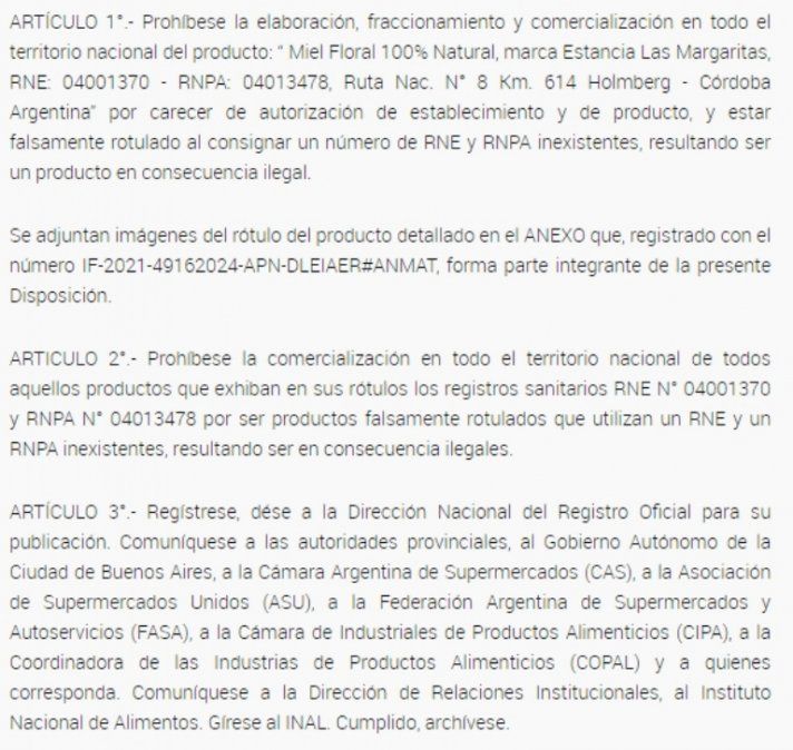 Según consigna la disposición, la denuncia de un consumidor en el Departamento de Vigilancia Sanitaria y Nutricional de los Alimentos del Instituto Nacional de Alimentos (INAL) dio inicio a una investigación sobre un producto adulterado, que en sus etiquetas decía: "Miel Floral 100% Natural, marca Estancia Las Margaritas, Peso Neto 1000 gr., Vencimiento 10/2021, RNE: 04001370 - RNPA: 04013478, Ruta Nac. N° 8 Km. 614 Holmberg - Córdoba Argentina".