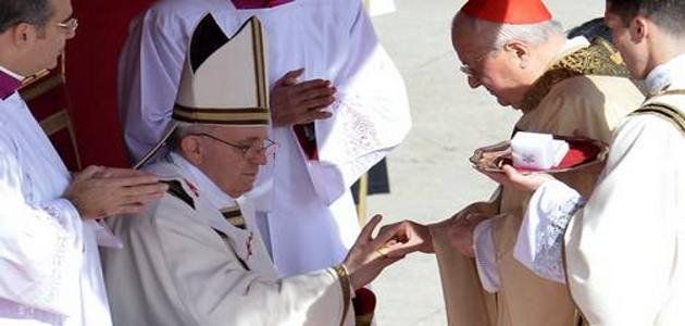 El cardenal protodiácono Jean Louis Tauran, el purpurado francés que el miércoles 13 de marzo anunció al mundo “habemus papam”, le colocó el palio con cruces rojas, símbolo del Buen Pastor, mientras el cardenal Angelo Sodano, decano del Colegio Cardenalicio, le entregó al papa el Anillo del Pescador, de plata bañado en oro que confeccionó el orfebre pontificio Enrico Manfrini.