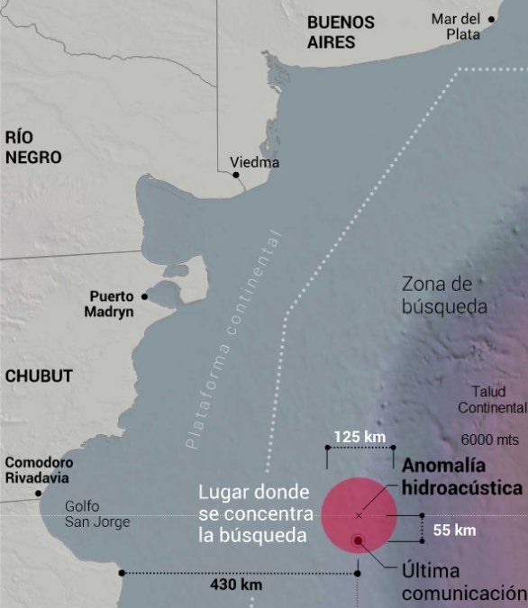 El último parte oficial de la armada confirmó que agotadas las posibilidades de hallar el submarino cerca de la plataforma continental los esfuerzos de búsqueda y rescate se van a centrar en la zona del talud.