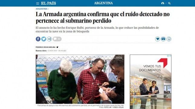 La nota, acompañada por un video propio con imágenes del operativo de búsqueda, declaraciones de Balbi y de los familiares en la Base Naval de Mar del Plata, es una de las más leídas de su sección Internacional.