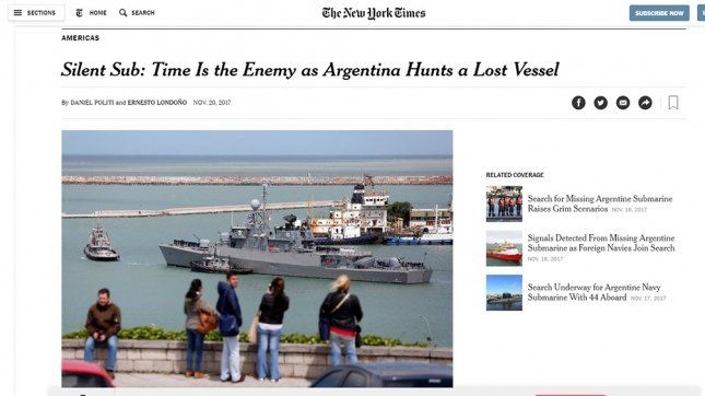 “El tiempo es el enemigo mientras Argentina busca una embarcación perdida”, titula el diario sobre el caso del ARA San Juan, con testimonios de los familiares de los tripulantes y una infografía de la zona de búsqueda.