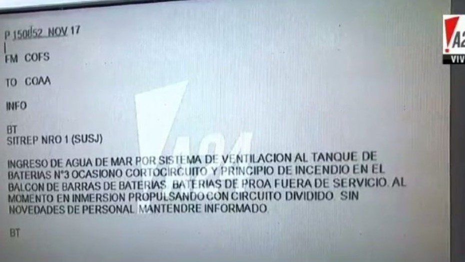 Este es el último mensaje que envió el submarino ARA San Juanel miércoles 15 de noviembre, día en el que se perdió complemente contacto con la nave junto a sus 44 tripulantes. El documento fue revelado hace instantes por el canal A24.