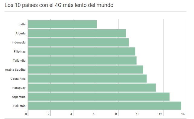 La Argentina es uno de los 10 países con el 4G más lento del mundo. El promedio de velocidad de descarga es de 12,53 Mbps, apenas por encima de Paraguay (11,31 Mbps) y por debajo de Pakistán (13,56 Mbps).