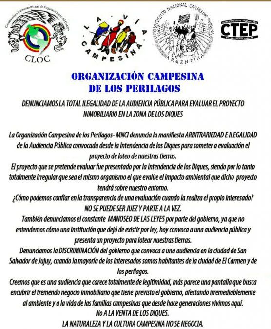 En ese sentido, la intendencia de los diques convocó a una audiencia pública para hoy viernes 9, a las 8:00 hs. La Organización Campesina de los Perilagos rechazó el llamado de audiencia pública por considerarlo irregular. Mediante un comunicado, dijeron que no fueron informados de manera oficial y que, por otra parte, no se lo difundió con anticipación. También se refirieron a la falta de respuestas sobre el proyecto, advirtiendo que no se conocen con precisión las obras que se pretenden poner en marcha ni en qué condiciones.
