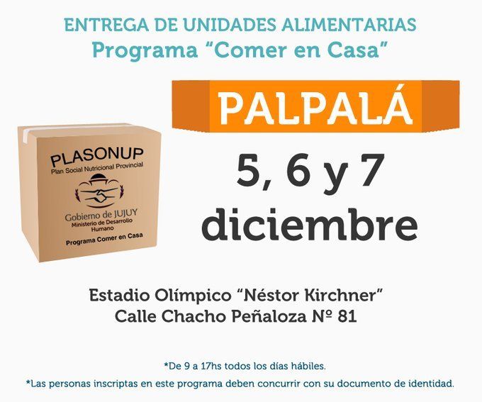 Continúa la entrega de unidades alimentarias correspondientes al Plan Comer en Casa. La misma inicia en esta jornada y termina el próximo 7 de diciembre, en el estadio Olímpico Néstor Kirchner ubicado en la calle Chacho Peñaloza N° 81.