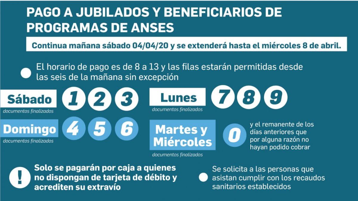 El Comité Operativo de Emergencias anunció que luego de todos los problemas que se vivieron en bancos con el cobro de jubilaciones, se dispusieron medidas especiales a los fines de garantizar el aislamiento y cuidar a los adultos mayores. Se divide a los beneficiarios para el cobro según la terminación de documento, el pago será del sábado hasta el miércoles.