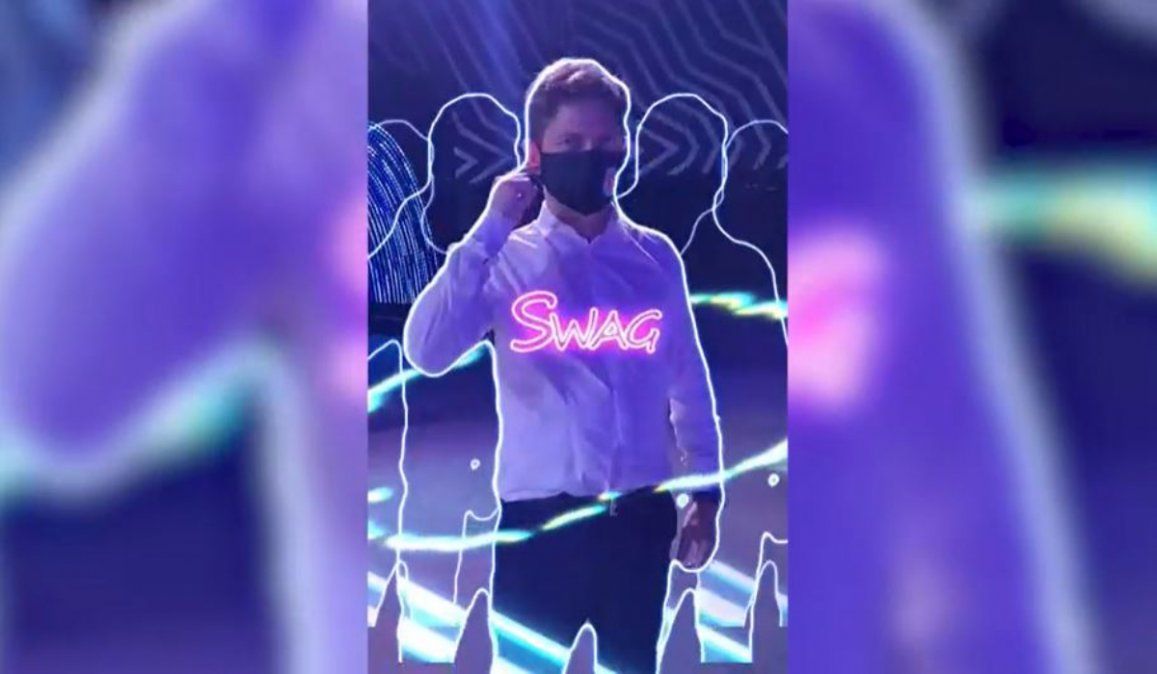 Con la canción “In Da Getto”, uno de los últimos lanzamientos del reconocido reguetonero colombiano J Balvin, sonando de fondo, Kicillof, que en el corto aparece en medio de la pista de baile, se saca el barbijo y cuenta la novedad al público.