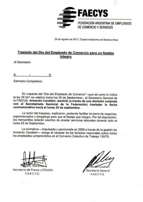 El “Día del Empleado de Comercio” tal como lo indica la Ley 26.541 se celebra todos los 26 de septiembre. Para este año se resolvió a través de una decisión conjunta con el Secretario Nacional de la Federación, trasladar la fecha conmemorativa hacia el lunes 25 de septiembre.