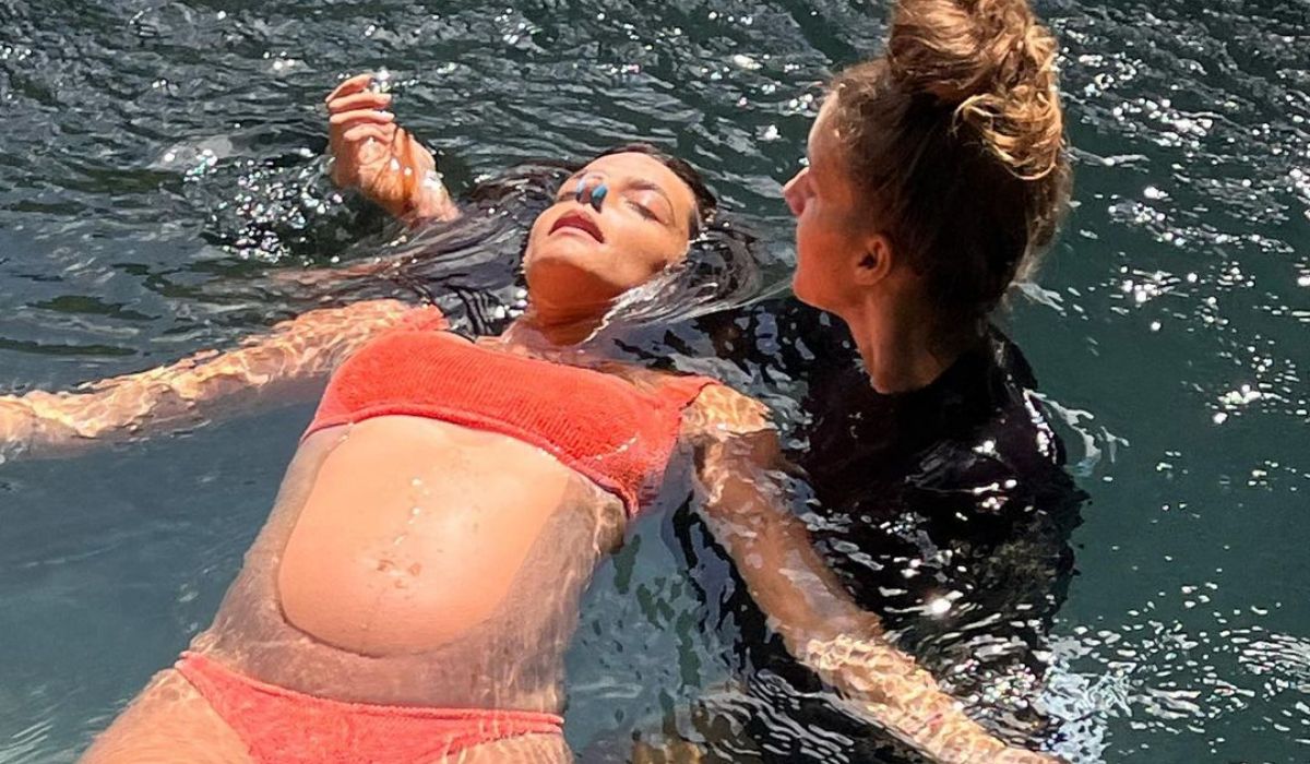La actriz subió un video donde se la ve haciendo plancha con los ojos cerrados donde una mujer la trasladaba, también metida con la cabeza dentro del agua. En la publicación explicó el proceso y le dio gracias a Aito de la Rúa, su pareja y padre del bebé en camino, por la experiencia de poder conectar con sus padres y su futuro hijo.