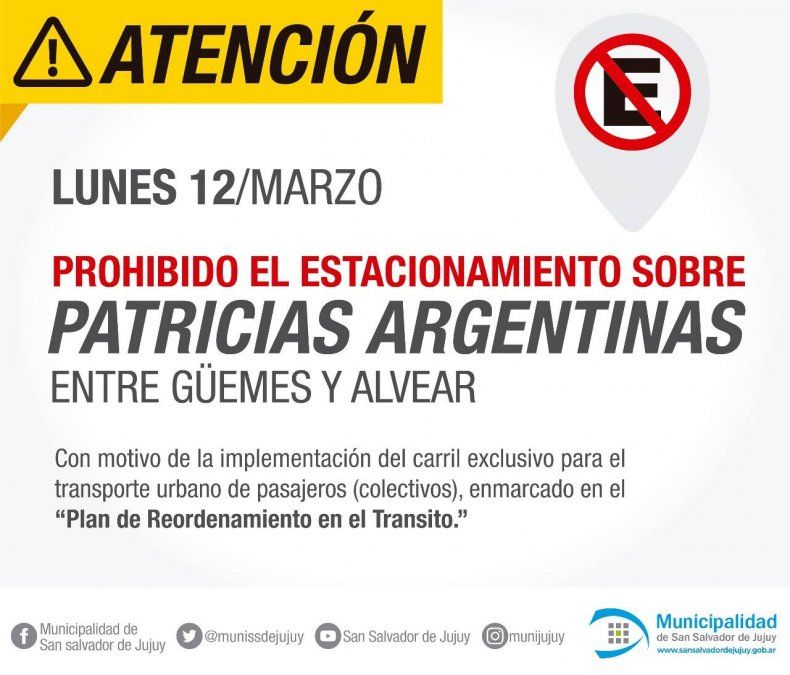 El municipio capitalino informó que a partir de este lunes no se podrá estacionar en calle Patricias Argentinas, en el tramo comprendido entre Güemes y Alvear.