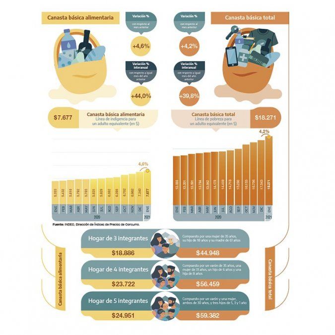 Las canastas básicas alimentaria y total aumentaron respectivamente 4,6% y 4,2% en enero de 2021 en relación a diciembre, y 44% y 39,8% interanual. Así, la CBA se situó en enero en los $7.677,09 para una familia tipo, mientras que la CBT alcanzó los 23.722 pesos.