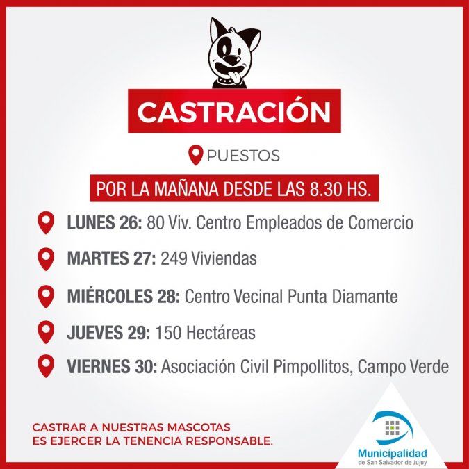 De igual manera los interesados pueden acercase al Centro Modelo de zoonosis, ubicado en av. Raúl Galán, anexo al mercado del barrio Santa Rosa, en la Delegación Municipal de Alto Comedero, en av. Forestal N°638 o en los consultorios del edificio 9 de julio, calle Oscar Orías y 9 de julio.