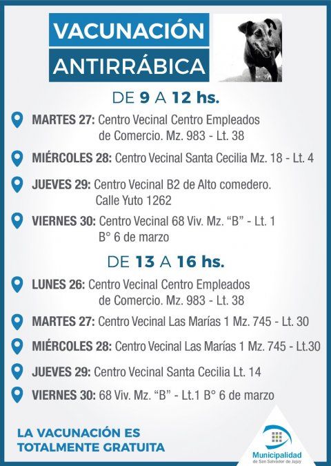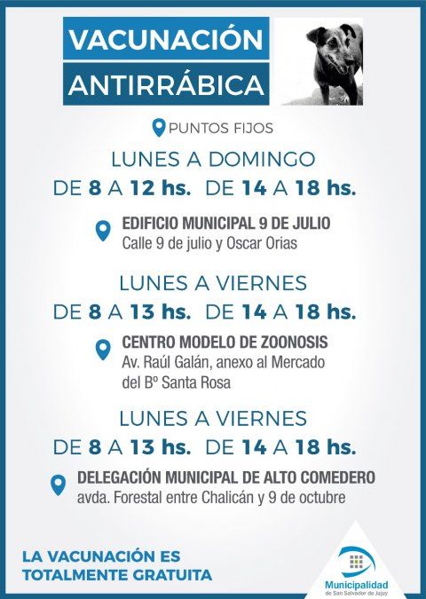 Los interesados pueden acercarse a los puntos fijos, en el Centros Modelo de zoonosis, la delegación municipal de Alto Comedero y el edificio 9 de julio. Además los equipos de vacunación estarán recorriendo los distintos barrios de la cuidad para que los vecinos se acerquen con sus mascotas.