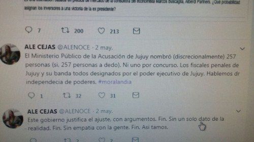 El 2 de mayo del corriente año, la diputada Alejandra Cejas denunció, en su cuenta de Twitter, que el ministerio público de la acusación habría nombrado a dedo a 257 personas a la vez que cuestionaba la independencia de poderes.