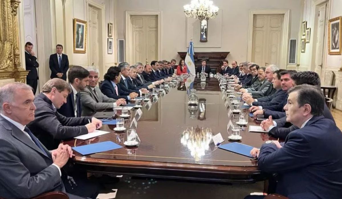 Milei, que estaba desde temprano en su despacho en el primer piso de Balcarce 50 junto a su hermana, la secretaria general de la Presidencial, Karina Milei, y el asesor en comunicación y estrategia Santiago Caputo, se sentó pasado el mediodía en la punta de la larga mesa de madera del salón Eva Perón. A su izquierda se ubicaron el jefe de Gabinete, Nicolás Posse, el ministro del Interior, Guillermo Francos -el organizador el encuentro- y Karina Milei. A su derecha se ubicaron la vicepresidenta, Victoria Villarruel, presidenta del Senado, y el titular de la Cámara de Diputados, Martín Menem. En tanto, cada gobernador tenía pre-asignado un lugar específico, marcado con sus nombres en papelitos ubicados frente a cada silla. El bonaerense Axel Kicillof fue ubicado en el punto más cercano al Jefe de Estado, al igual que el catamarqueño Raúl Jalil