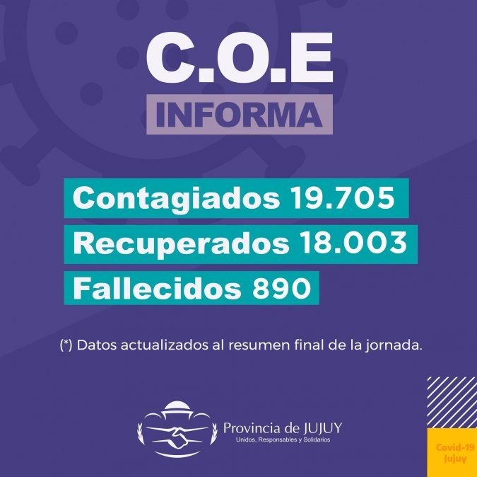 Se notificó 1 fallecimiento por Covid-19: una mujer de 83 años de edad. Cabe aclarar que el fallecimiento reportado, es informado por el Registro Civil de la Provincia de Jujuy y corresponde a días anteriores.