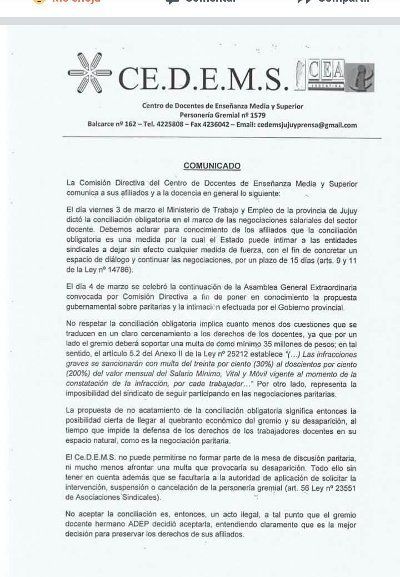 En este sentido, el secretario general del CEDEMS, Ricardo Ajalla, manifestó en conferencia de prensa que “el día 4 de marzo se realizó la asamblea extraordinaria convocada por la comisión directiva, el día anterior habíamos recibido una notificación por parte del Ministerio de Trabajo de la provincia en la que nos convocaban a una conciliación obligatoria. El día sábado se realizó la asamblea donde se había decidido por mayoría no aceptar la conciliación obligatoria”.