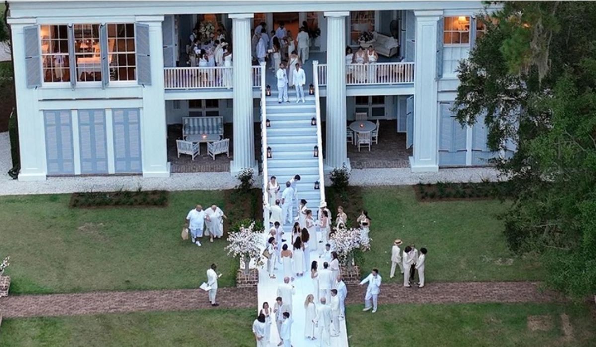 Las imágenes publicadas por el sitio de chismes de celebridades TMZ antes de la boda mostraban la disposición de los asientos para la cena en lo que parecía ser un gran muelle cubierto. El medio también señaló que la pareja llegó en una lancha.