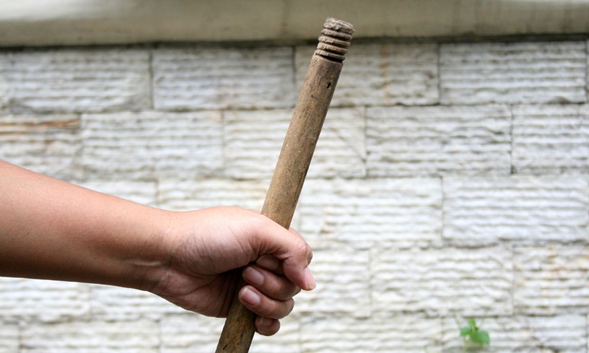 - El sujeto amenaza con un palo de madera a los transeúntes.