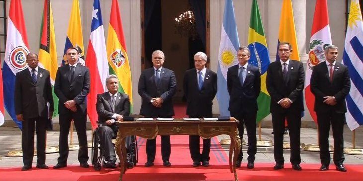 Los ministros de Relaciones Exteriores de los países firmantes recibieron el mandato de profundizar el diálogo para implementar gradualmente el Prosur, consignó la agencia EFE. La Declaración de Santiago fue firmada por los presidentes de Argentina, Mauricio Macri; Brasil, Jair Bolsonaro; Chile, Sebastián Piñera; Colombia, Iván Duque; Ecuador, Lenin Moreno; Paraguay, Mario Abdo Benítez; y Perú Martín Vizcarra junto al embajador de Guyana en Chile, George Talbot.