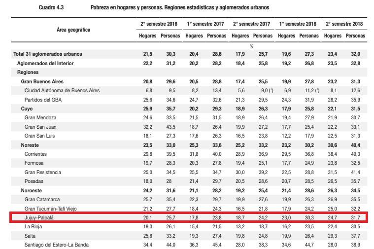 Ahondando más en profundidad el informe del organismo, se puede apreciar la región NOA quedó por encima de la media nacional, pero en el caso puntual del conglomerado Jujuy-Palpalá la cifra es mínimamente inferior a la del país.
