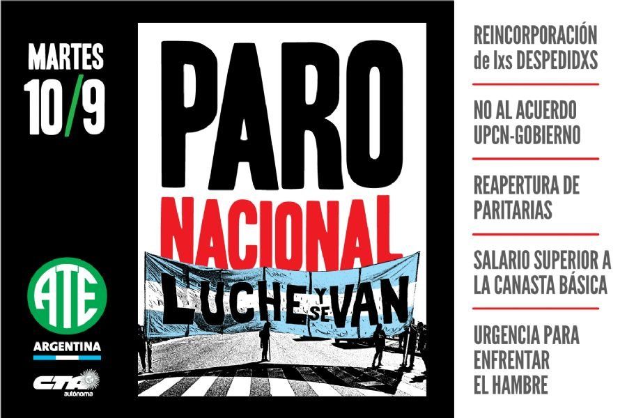 La Asociación de Trabajadores del Estado confirmó que el próximo martes 10 de septiembre lanzarán un paro nacional con movilización en todo el país. ATE Jujuy ya confirmó su adhesión.