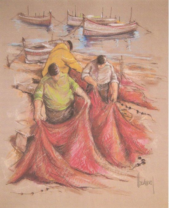 "Pescadores trabajando con las redes” por Manuel de Amores.