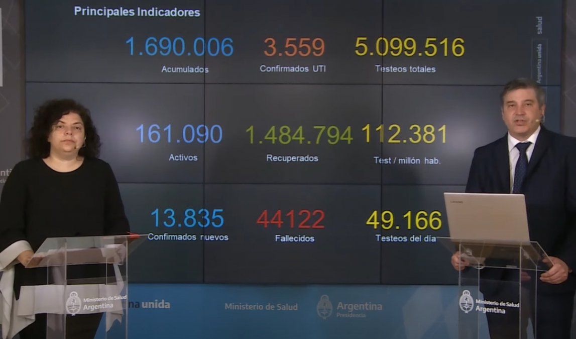 En relación a las cifras sobre coronavirus en Argentina, se informó que el total de fallecidos asciende a 44.122, mientras que fueron notificados ayer 13.835 nuevos contagios, con un total de 1.690.006 infectados.
