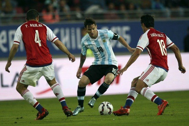 El primer tiempo fue un dominio absoluto de Argentina. Desde el primer minuto el trámite quedó claro. Los once paraguayos en su campo, parados 4-5-1, con una marca escalonada. Salía Víctor Cáceres a hacerle sombra a Messi, lo relevaba Ortigoza y esperaban agazapados los defensores para achicar líneas. Así trataban de cortar el circuito de juego argentino.