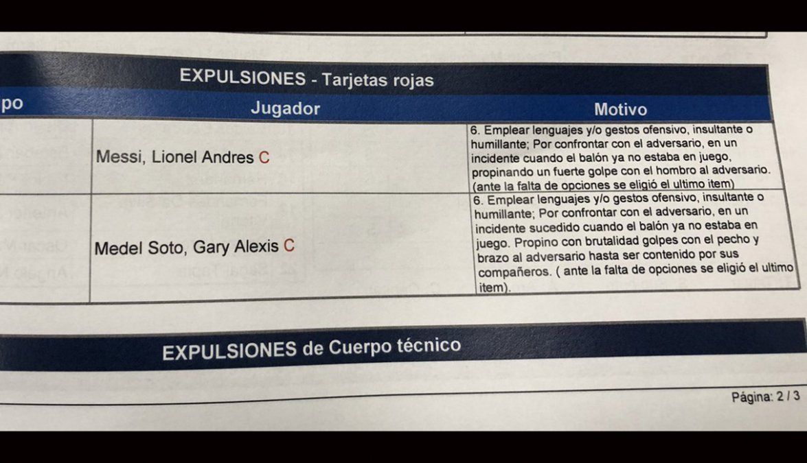 Motivo roja a Lionel Messi: "Emplear gestos y/o ofensivos, insultante o humillante. Por confrontar con el adversario en un incidente cuando el balón ya no estaba en juego, propinando un fuerte golpe con el hombro al adversario".
