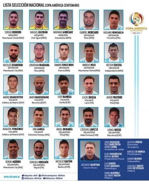 BUENOS AIRES, (DyN) - La siguiente es la lista de 23 jugadores del seleccionado argentino de fútbol que participarán de la Copa América Centenario en los Estados Unidos.