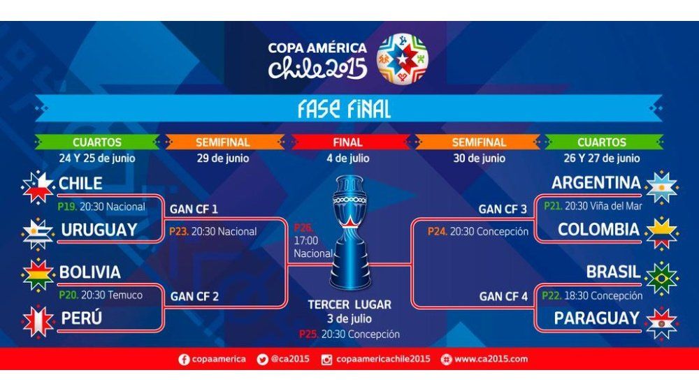 En consecuencia, el conjunto brasileño que levantó por última vez esta Copa América en Venezuela 2007 se medirá ante Paraguay el sábado 27 en Concepción y en caso de que ambos pasen habrá Superclásico sudamericano contra Argentina en la semifinal que se disputará en la misma ciudad del sur chileno.