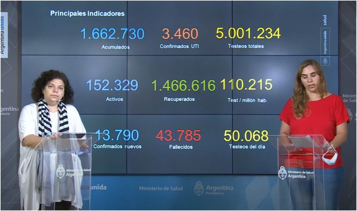 En relación a las cifras sobre la pandemia, se informó que el total de fallecidos por coronavirus asciende en el país a 43.785, mientras que fueron notificados ayer 13.790 nuevos contagios, con un total de 1.662.730 infectados.