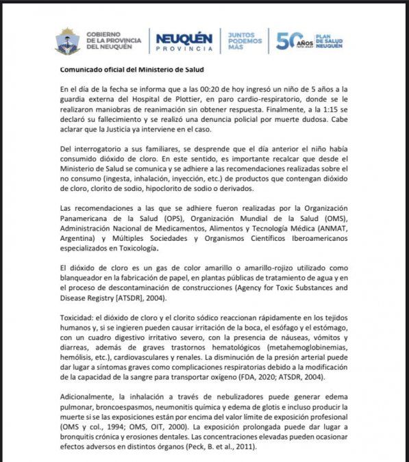 Un niño de 5 años murió como consecuencia de un paro cardiorrespiratorio en la localidad de Plottier, luego de consumir dióxido de cloro diluido en agua el día viernes, según informó el ministerio de Salud de la provincia de Neuquén.