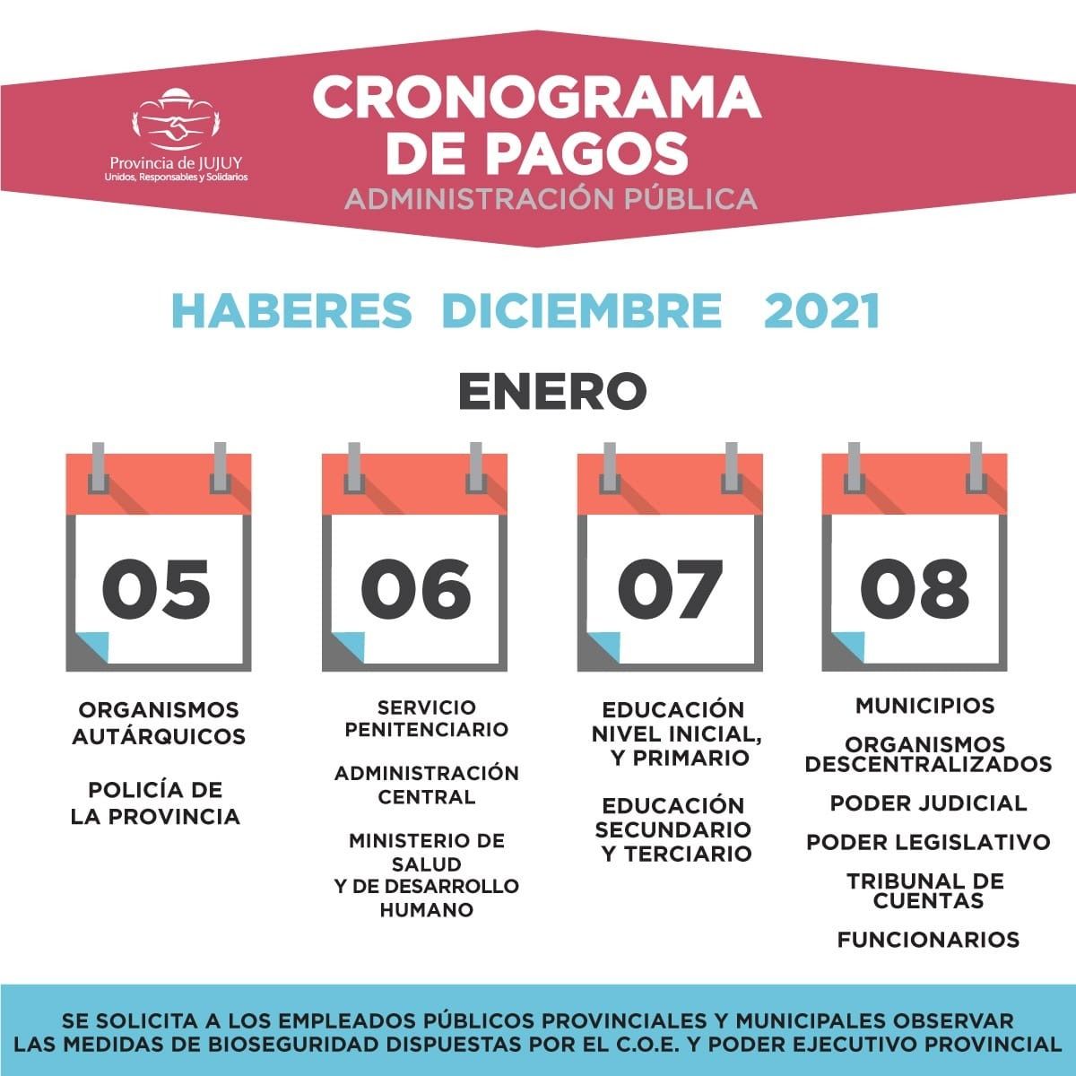 Tesorería de la Provincia dio a conocer el cronograma de pagos correspondiente al mes de Diciembre del 2021.