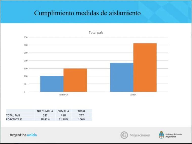 En total, son 287 personas en todo el país las que no se encontraban en el inmueble declarado cuando el personal de Migraciones fue a visitarlas, que representan el 38,42% de los 747 viajeros que fueron inspeccionados luego de su regreso, de los cuales 460 atendieron el timbre.