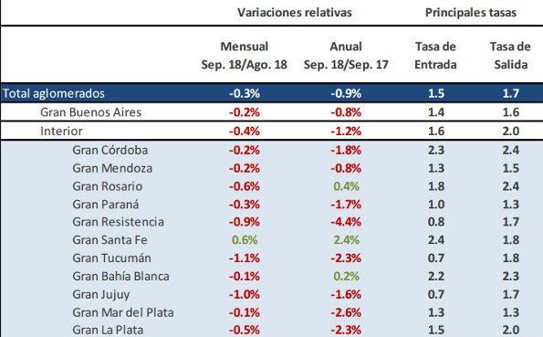En el último informe del Ministerio de Trabajo de Nación sobre la evolución del empleo registrado del sector privado de los principales centros urbanos correspondiente al mes de septiembre del 2018 respecto del mes de agosto, se observa un descenso mensual en casi todos los aglomerados.