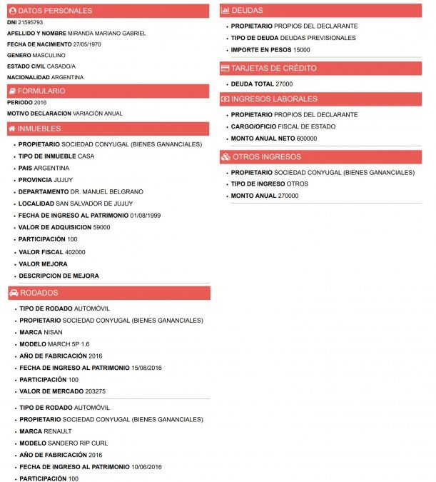 De hecho, en el sitio oficial de la Oficina Anticorrupción puede verificarse que funcionarios de menor jerarquía ya han realizado el trámite, declarando sus bienes personales hasta el año 2017, como exige la ley de ética pública vigente en la provincia.