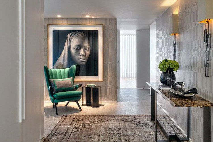 Otra tendencia propia de este tipo de recibidores amplios de aire exclusivo es combinar la fluidez espacial con un carácter expositivo de piezas valiosas como obras de arte y otros objetos de coleccionismo. Si eliges esta opción, ubica en una pared un pequeño sofá sin brazos, un banco tapizado o un par de otomanas. Destina también la pared de enfrente a aquellas piezas que quieras mostrar, colgadas de la pared o sobre un pedestal en el caso de esculturas.