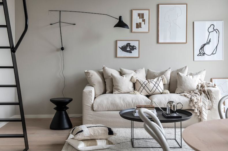 Este departamento sueco es pequeño, pero sus metros cuadrados no son excusa para poder derrochar estilo y buen gusto. Basando su decoración es tonos neutros gris y beige, y algunos acentos negros, logran un montón de textura y espacios acogedores, lo que es la prueba de que no se necesita de una gama completa de colores para crear un lugar maravilloso.