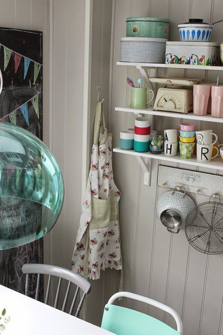 Incluir accesorios vintage a la cocina como un reloj, carteles de época, menaje de cocina de cerámica, cristalería, recipientes reciclados de época, son algunas alternativas que puedes incluir para que este espacio luzca más acogedor. El uso de cortinas y manteles con patrones florales y encajes son también muy utilizados en la decoración shabby chic.