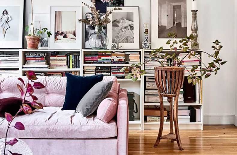 Los colores rosados en el living, el terciopelo de los sofás y los zapatos expuestos en el mueble del comedor, son algunas de las cosas que nos hacen percibir la vivienda de manera delicada y femenina, y por otro lado, la mezcla de muebles de diferentes estilos decorativos junto con el fuerte color de las murallas hacen que esta casa sobresalga de lo típico y logre distinguirse del resto.
