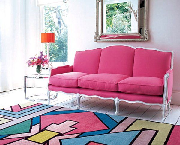 Para una sala de mayores proporciones, un sofá grande de color rosa no resulta tan desencajado, por eso es una buena oportunidad para incluirlo. De la misma forma se pueden utilizar una consola u otro mueble auxiliar, también en las alfombras. Si utiliza un sofá en un color fuerte, es recomendado que el resto no sea de las mismas características.