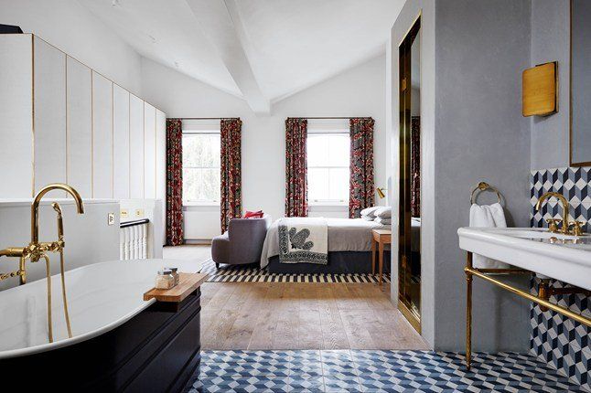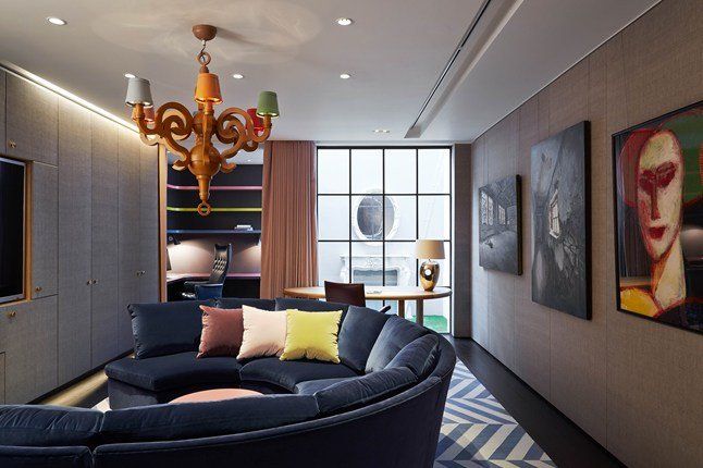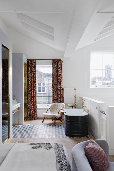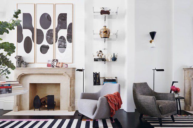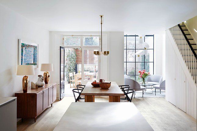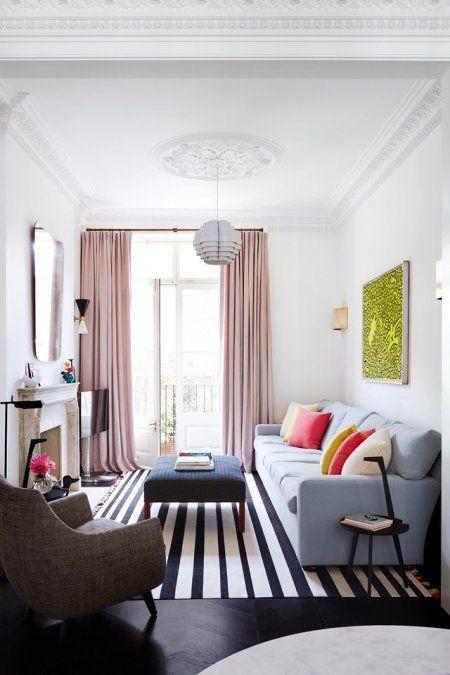 Gracias a un enfoque openspirited a la coalescencia de las ideas, el resultado es una lección de equilibrio y contrastes armoniosos. Una alfombra gráfico galón en pastel de menta sienta contra azul marino, cortinas-print étnico en el dormitorio. Rayas en blanco y negro y gigantes aparecen de la nada en una cocina de lo contrario silenciado que abarca la cocina de menor planta baja. Oscuro cojines de terciopelo rosa hacen una proyección inesperada en una sala de prensa masculina.